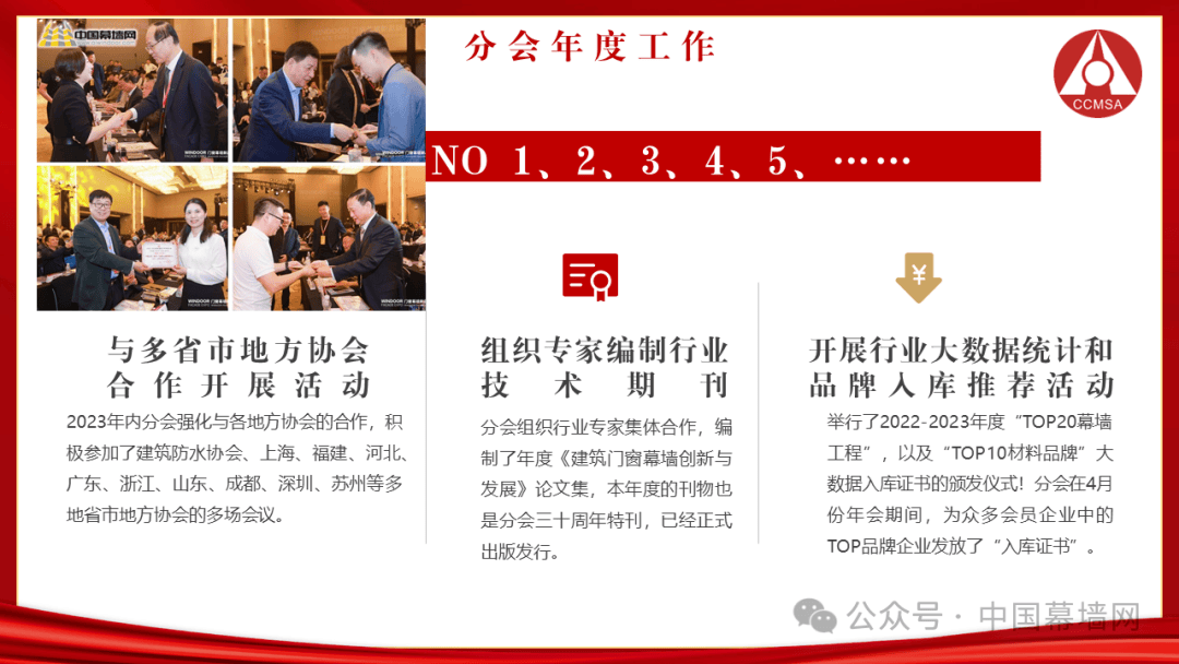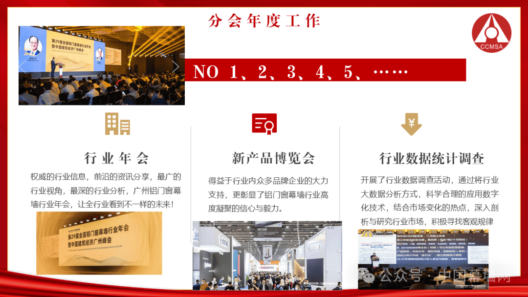 2024年分会积极开展铝门窗幕墙行业的全面工作,坚持高质量发展,紧抓时代特色,以行业企业需求为核心,以平台性、公允性、公开性为推动,开创中国铝门窗幕墙行业现代化的新局面。坚定不移的以“二十大”精神为指导,实施四轮驱动策略,推动行业高质量发展。根据国家总体方向,用“保险服务、双碳指导、绿色认证和清洁能源”四项举措,把全行业推向高质量发展的快速道。