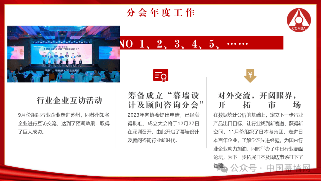 以开拓的眼光看待行业,以发展的目标推动行业,2023门窗技术培训班的会员企业服务活动,分会一口气举办了两期;2023全国幕墙设计及顾问专家会、第三届718上海幕墙共享设计节更是推动行业设计水平提高的重要活动,大大小小数十场各类服务及平台交流活动方便了分会会员企业的市场与管理、技术提高,为拓展会员的视野,更好了解国外市场及行业趋势,为帮助会员学习先进制造技术,了解最新制造业市场趋势,为加强整合协会内外资源,探讨行业未来发展方向做出了贡献。